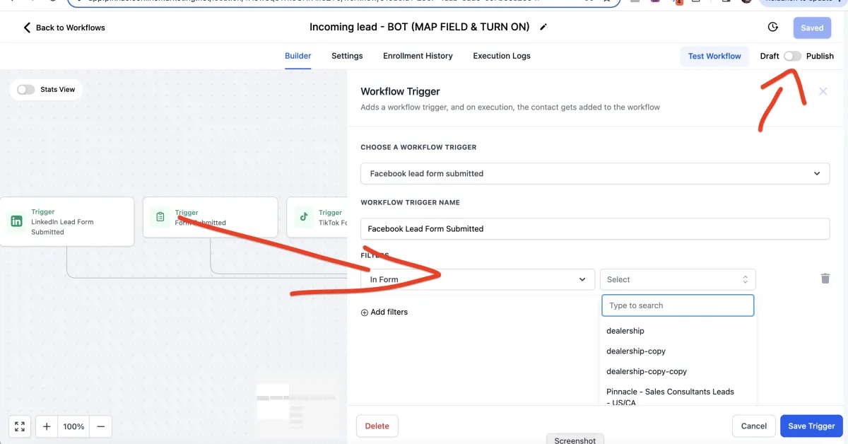 3. OPEN WORKFLOW 'INCOMING LEAD - BOT' AND INSERT ANY FORMS YOU ARE CURRENTLY RUNNING FOR ADS AS TRIGGERS. PUBLISH & SAVE.