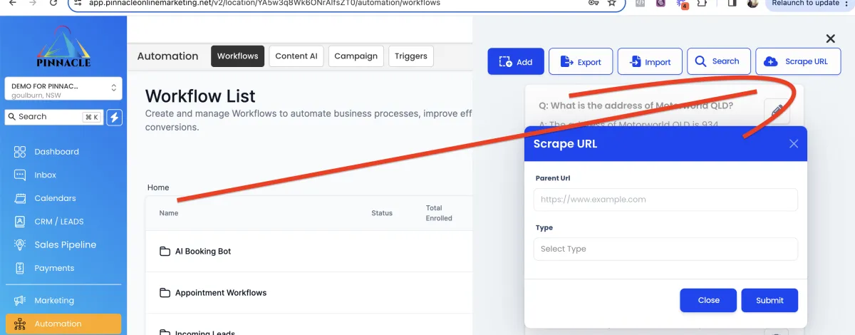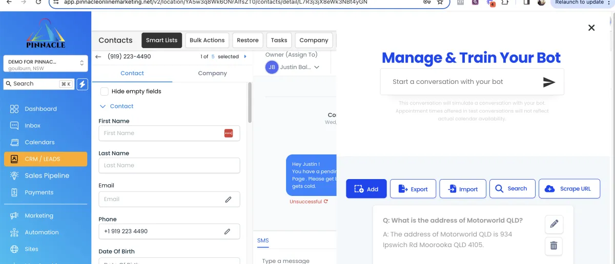 3. CLICK 'CRM/LEADS', OPEN A PROSPECT. SELECT THE BOT AGAIN TO OPEN THE TRAINING FUNCTION AND CHAT WITH YOUR BOT.