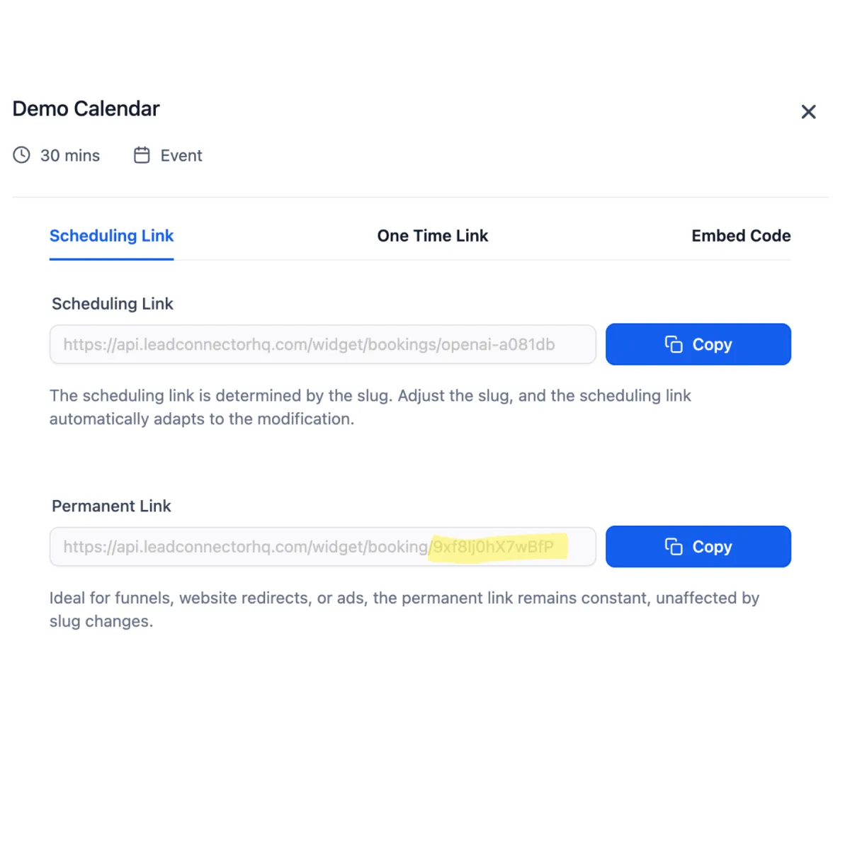 5. COPY YOUR 'PERMANENT CALENDAR' ID (ONLY COPY AFTER 'BOOKING/'. PLEASE NOTE THE PICTURE BELOW SHOWS WHAT YOU DO NOT NEED)